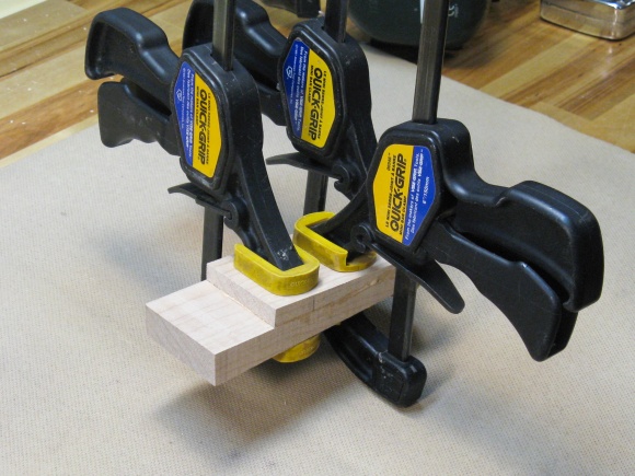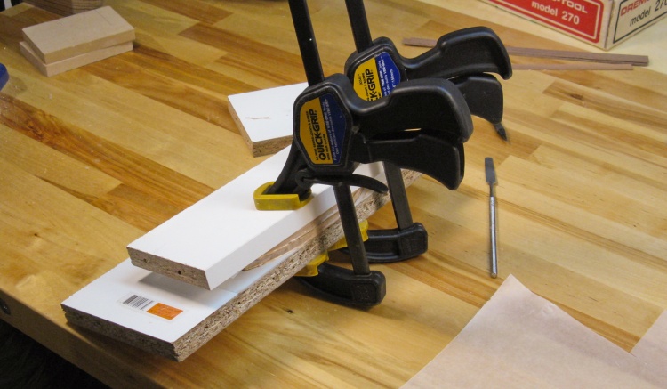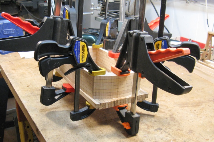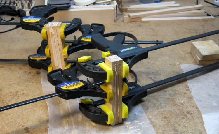 In this shot, the four layers (two each of maple and walnut) forming one of the ends is being glued and clamped between some nice flat pieces of melamine.