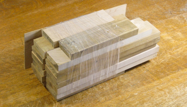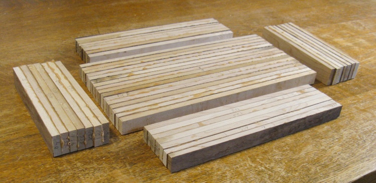 I was concerned about the layers on adjacent sides being slightly different in thickness and having a visible misalignment where the layers stacked up side-by-side. I hoped to help by planing a group including pieces from each of the sides and ends (which would theoretically all be the same thickness) and using them in common layers. The plys are designated for layers 1, 2 or 3 as can be seen from the end markings.