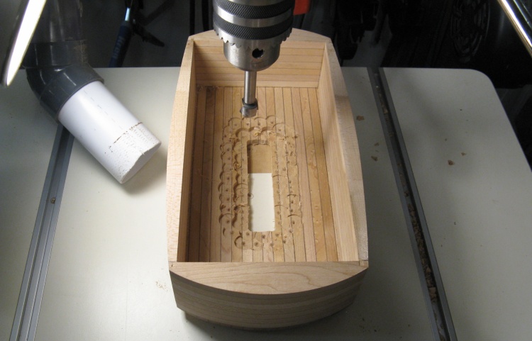 I wanted a thinner section visible where the tissues came out, so I needed to remove wood around the hole on the underside of the cover. With the walls in place it was a bit tough to access, so I used a forstner bit in the drill press to rather crudely remove the bulk of the wood.