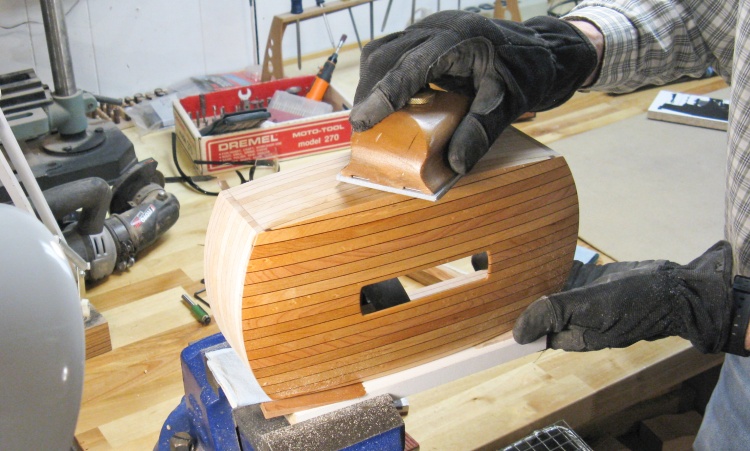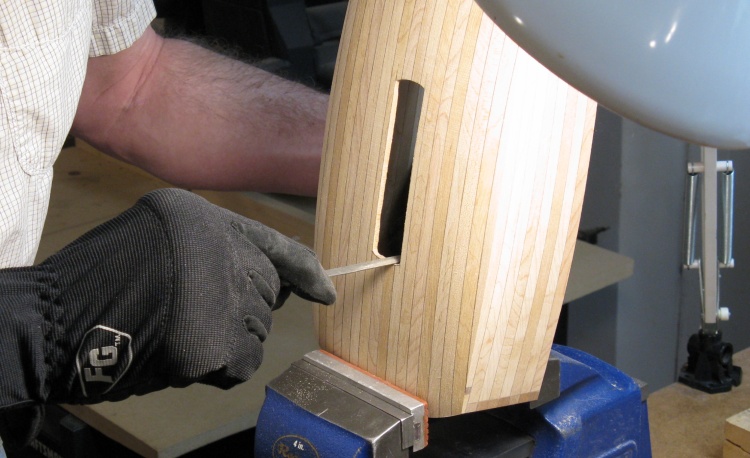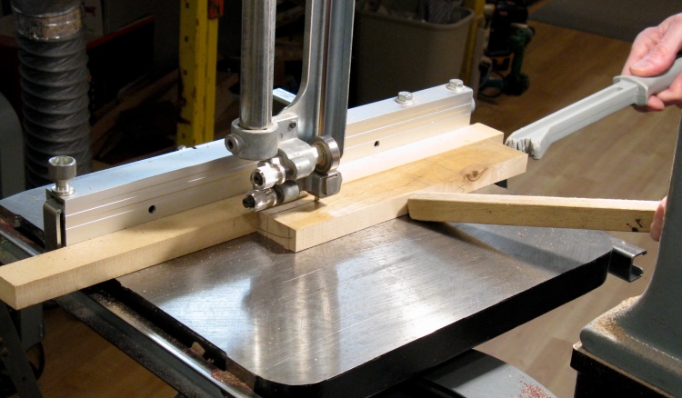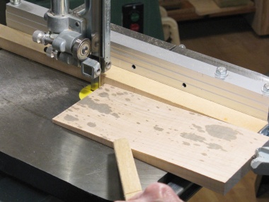 The plys for the ends needed to be wider to accommodate the deeper curve. Here I'm cutting a plank into two of the proper width for the ends. Unfortunately, they weren't quite thick enough to get more than a single ply out of the available thickness.