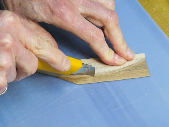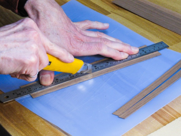 Between the maple layers are of course the thin layers of walnut, cut from veneer. I had a couple small pieces of veneer that would be enough for this little application. These shots show the veneer being cut for the sides and ends;
