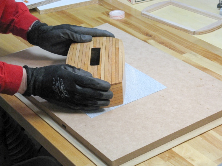 The bottom needed to be nice and flat to make a good joint with the new layers, so I used a sheet of 150 grit sandpaper on a piece of MDF with generous lashings of elbow grease to produce a uniformly flat bottom.