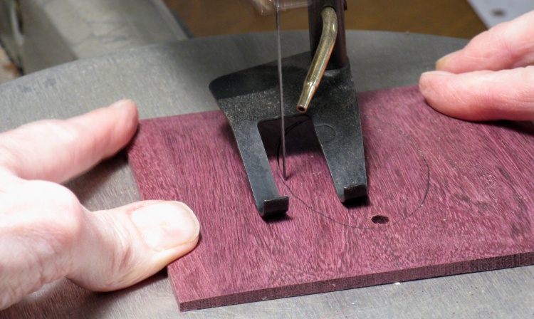 This shot shows the lip on the top side as the second curved cut is being started. The brown piece of wood I'm holding is taped to the purpleheart cover and provides a safe away-from-the-blade handle while keeping it vertical for the sawing operation.