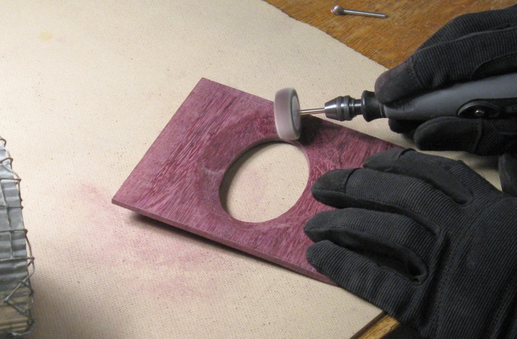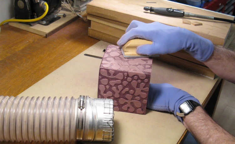 The middle section where the tissues come through was the thickest part of the cover, but I thought it would look (and work) better if the edges were thinner. To get there I used a cutting bit on the Dremel to remove material on the underside of the cover and this shot shows a subsequent sanding process using a flap-wheel sander.