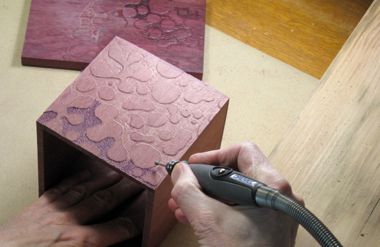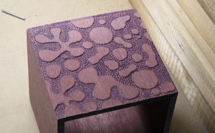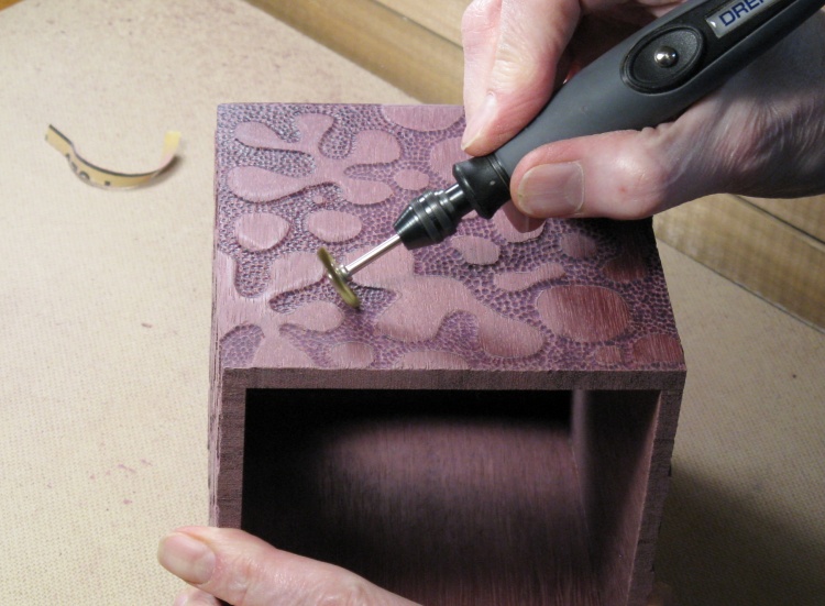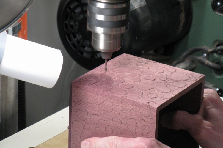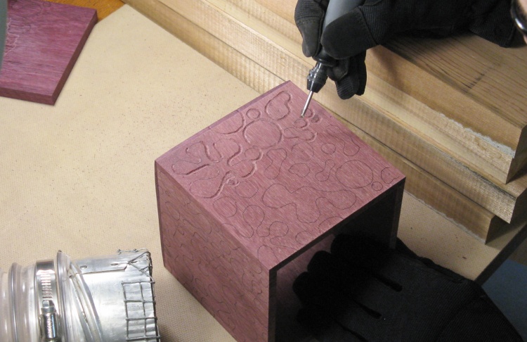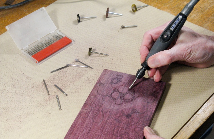 I used a small plank of purpleheart that was in my shop and tried to create the pattern and the background texture with various Dremel bits. I eventually arrived at an approach that I liked involving a spherical bit and a brass brush, so I was more comfortable moving ahead.