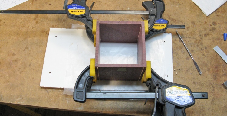 After drilling the dowel holes in all the sides, dowels were inserted and the sides were glued together and clamped.