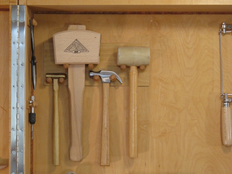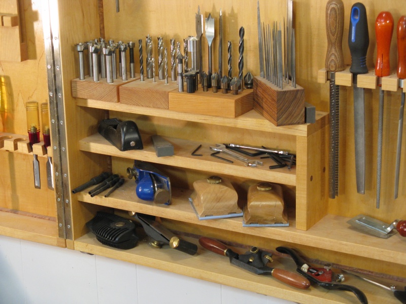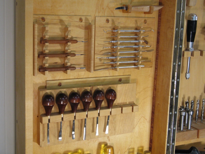 I made some removable tool holders like the ones for the carving tools on the left and the drill bits. That way, I can pull out a full set of tools to use without running back and forth.