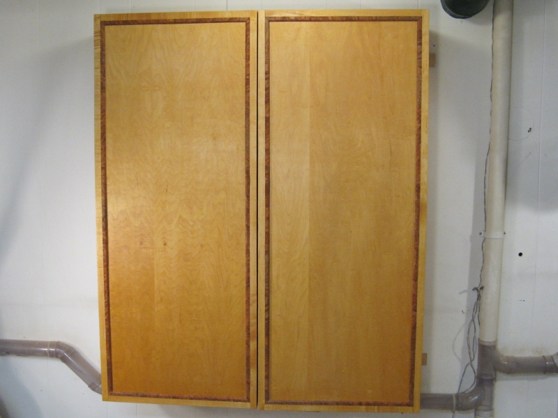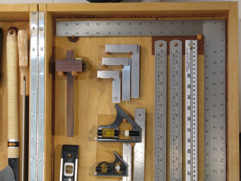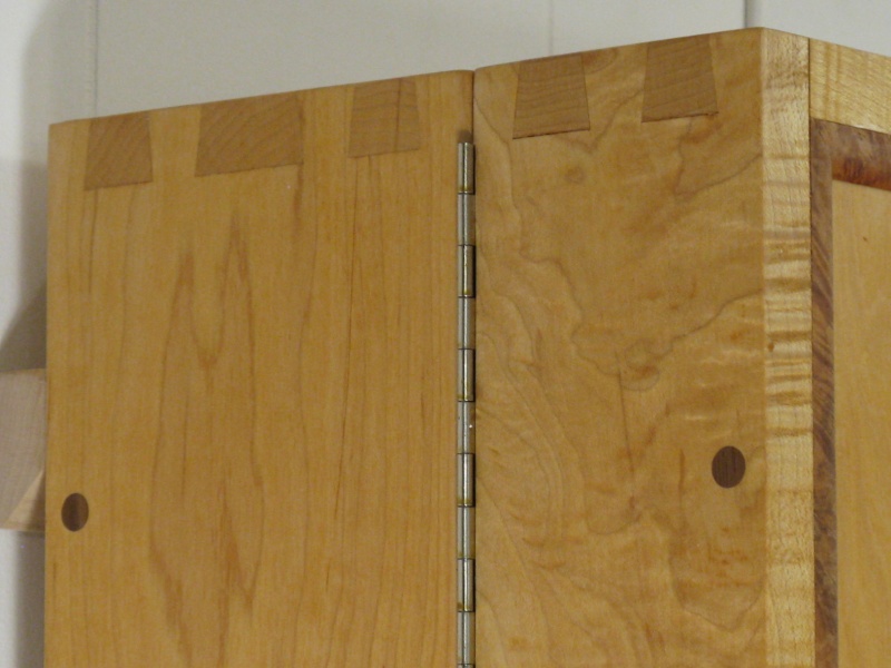 I decided I needed a central place to store most of my woodworking tools. I had always liked the idea of a wall-mounted tool chest since all items are visible and easy to get to, so I made this chest to mount on the wall of my workroom. It includes two piano-hinged doors, but I never bothered to add knobs or latches to the doors since I basically never close them. I thought building the frame would be a good excuse to practice dovetail joints - and it was, except I don't think I've done one since. I made the chest larger than I needed to to be sure I had room to accommodate new tool acquisitions. The chest is mounted using a pair of angled wooden hangers that mate to similar units on the wall. This lets it hang securely but also be easily removed. I've only removed the chest once, and the hangers were wedged so tightly together that I had to use a jack to lift the chest and break the connection of the hangers. So in theory, the hangers work like they are supposed to, but the reality is a bit different.