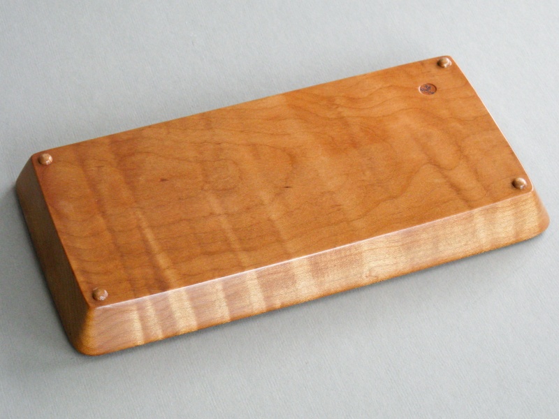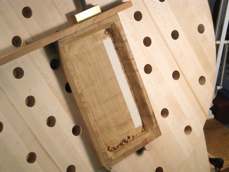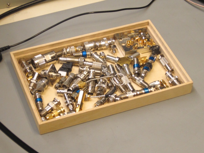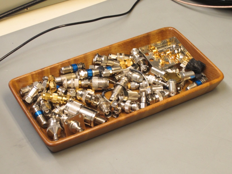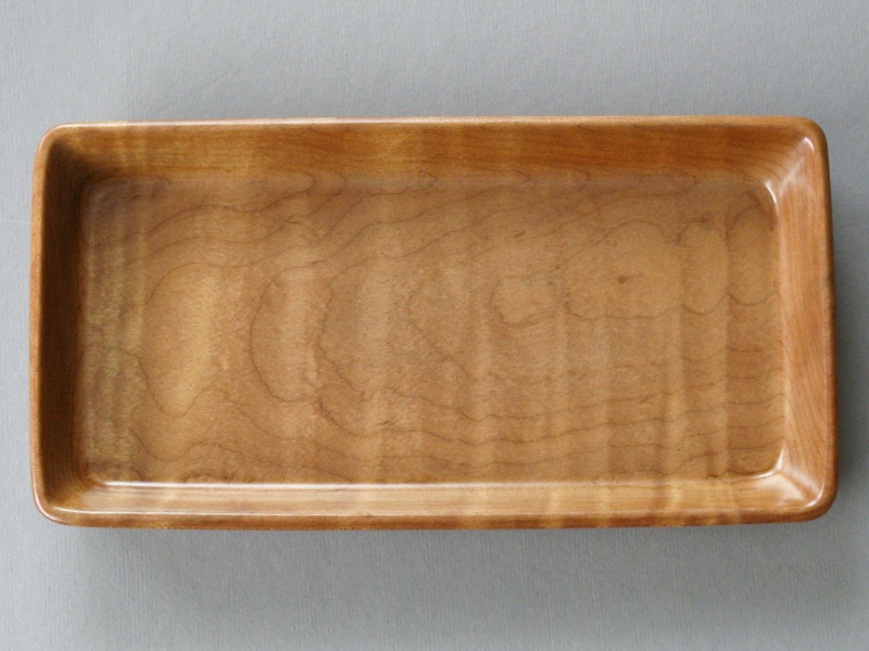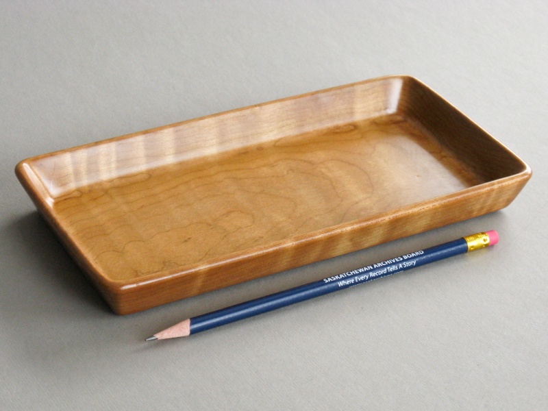 On my lab bench at work I was using a plywood box lid as a tray, which was employed to hold a selection of coaxial connectors. This worked fine except that of course it left the donor box lidless. I thought a nice little project would be to make a better-looking version. This replacement tray was made out of a single plank of roasted curly maple. I didn't want a seam, so that limited the width to the same as the plank, leaving it a bit less square than the original lid that it was to replace.