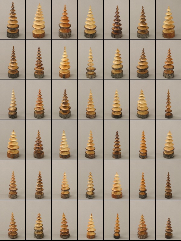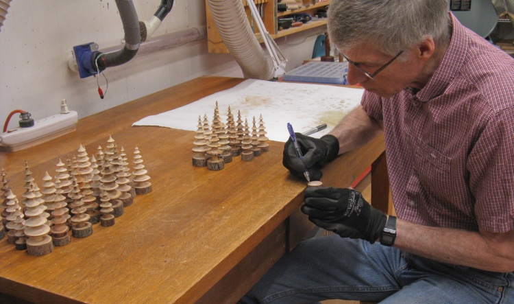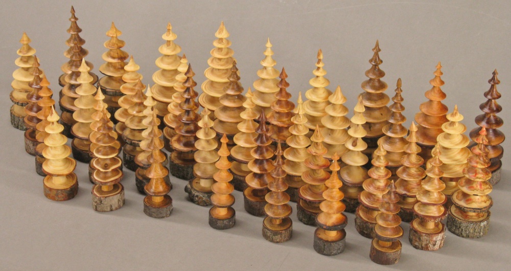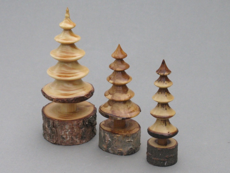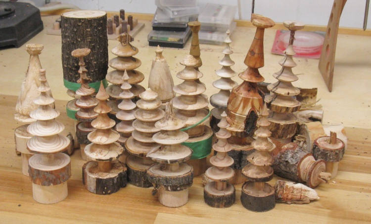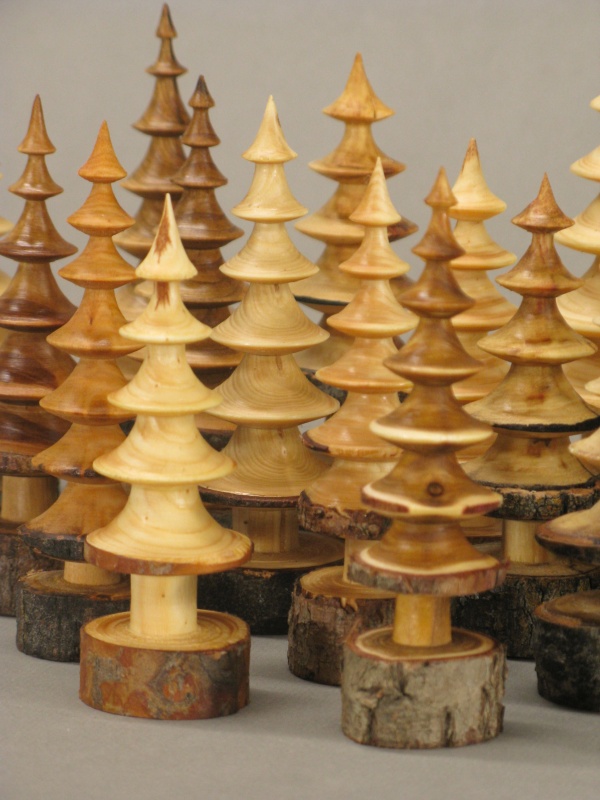 I had been planning to make some more sets of turned Christmas trees again this year, although I had envisioned a more getting-into-the-spirit date of maybe early December; snow on the ground, carols playing in the stores, too damned cold to go outside, etc. Fortunately they look just as Christmasy for being made in a July heatwave, plus it gave me an excuse to be in the cool basement.