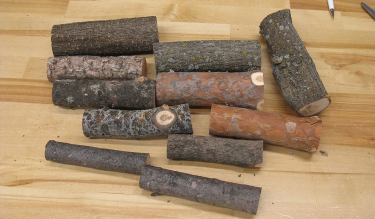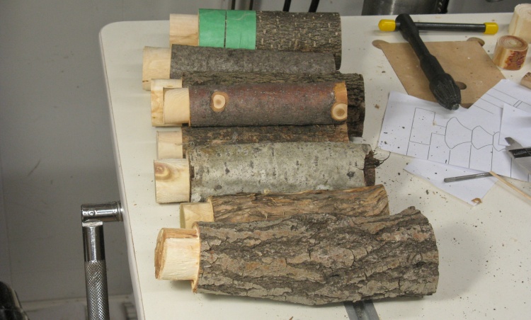 I didn't bother to try to stick with using the "ideal" wood (that being a nice piney-smelling Spruce branch) but that was OK since there are lots of wood types with more-interesting looking grain out there. I must confess I didn't closely track or even identify all the particular species used - although of course they are all local.