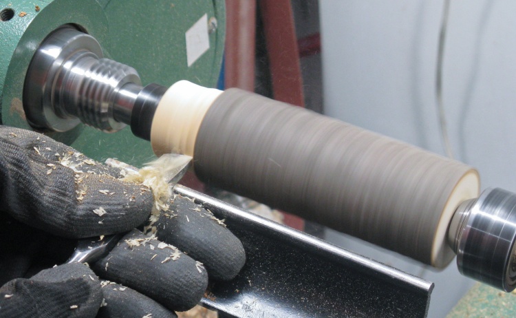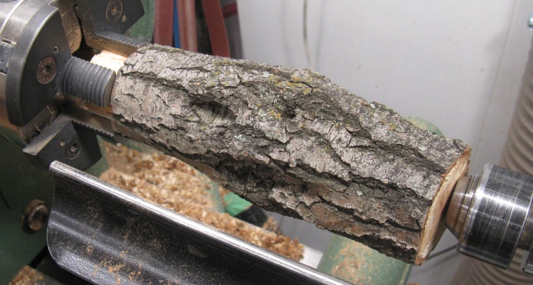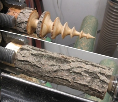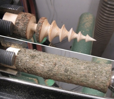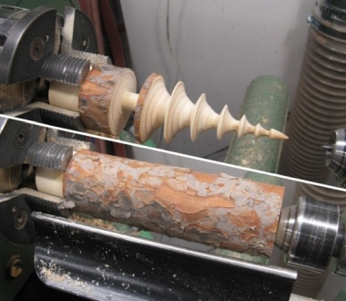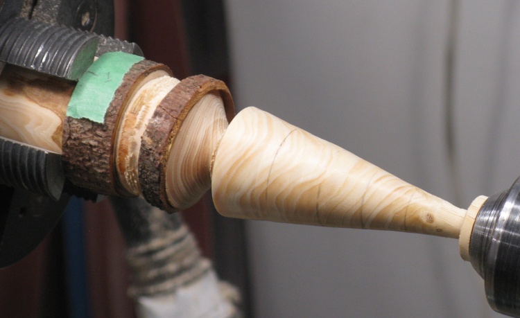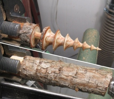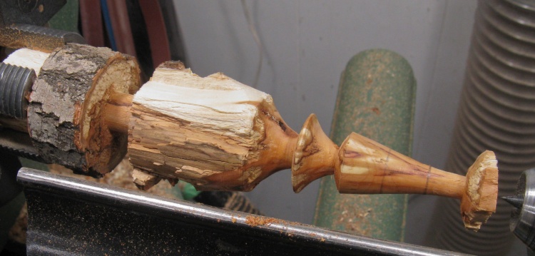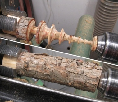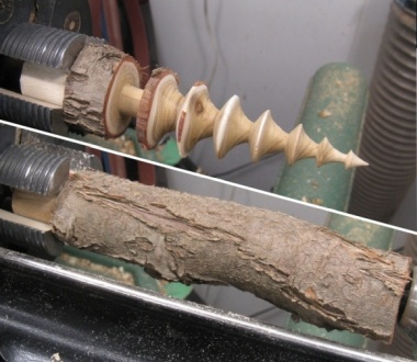 The tree-length pieces were turned on the lathe using a spur center so a shaft could be formed in one end.