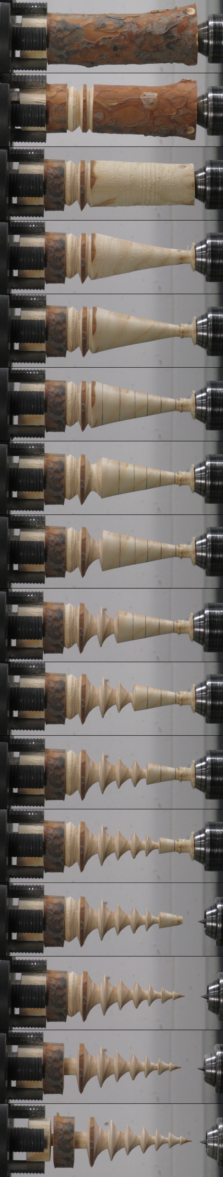 This rather long composite photo shows a piece of Scots Pine being formed step by step.