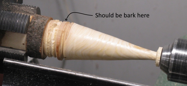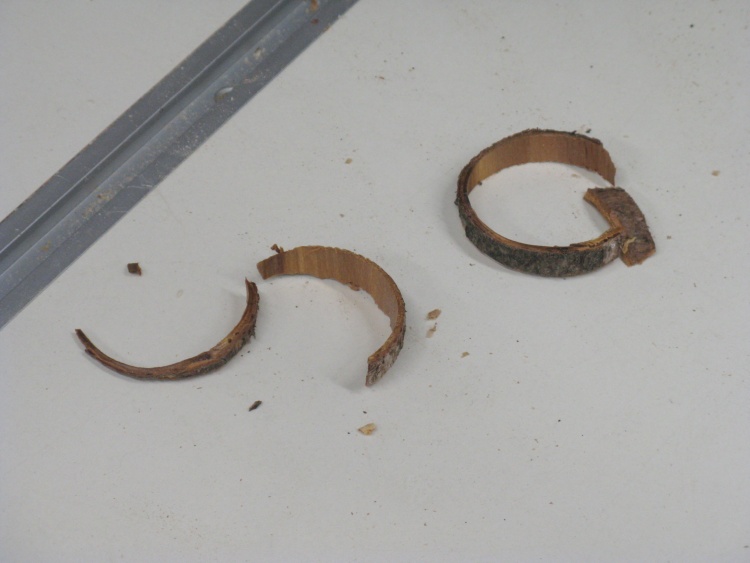 I usually had little success finding the small pieces of bark that flew off the thin sections so if the bark adhesion looked iffy I would try to cleanly cut some spare bark off the branch before turning. That's the source of these pieces.