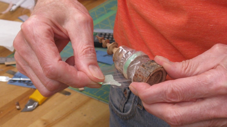 I almost never had a full circle of bark to glue on so the circumference was pieced together from a number of segments. Some or all the segments would be glued on (often linked with masking tape for easier handling) and then would usually be wrapped with stretch-film to apply pressure while the glue dried. That's what's happening in this shot (which astute readers will notice is not actually the same tree as on the lathe above).