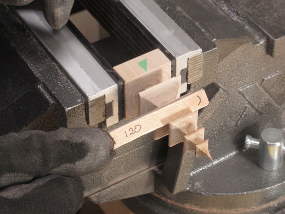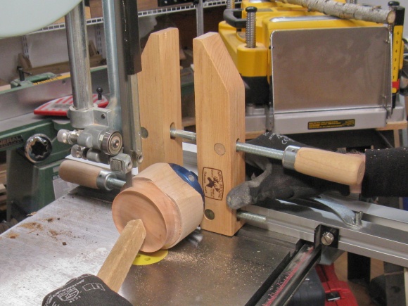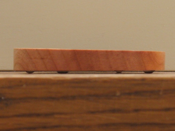 So this was a pretty simple matter of turning a base contoured to hold the plastic soap dispenser bottle, cutting it at a slight angle and applying some finish. I used Cherry to match the bathroom woodwork and these shots show the essential construction steps.