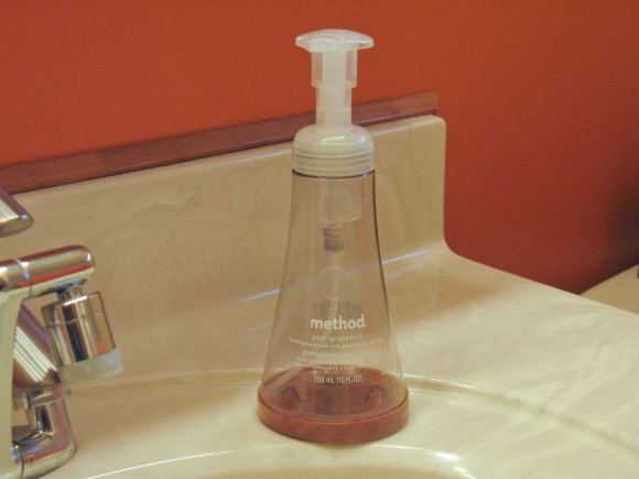 This is like the toothpaste tube where when it is essentially empty you can get another week's worth of brushing by squeezing it really hard. In the case of liquid hand soap, when you get to the bottom of a pump bottle there's often another week's worth of hand washing there, made accessible by tilting the bottle to make sure the pickup hose is at the bottom. Well, who wants to do that every time? But if a guy had a tilted base, it could be turned to make sure the pickup hose was at the lowest point and the penny-pinching urges would be satisfied with an elegant, matches-the-other-bathroom-woodwork manner.