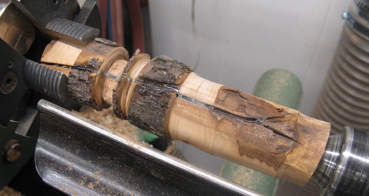 That was the case with this branch that looked to have a nice dark core but also a substantial crack. Turning branches with cracks is usually unsuccessful (pieces fly off) so on this one I filled the crack with epoxy to keep things together while turning.