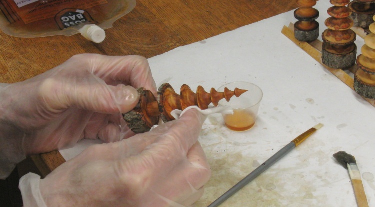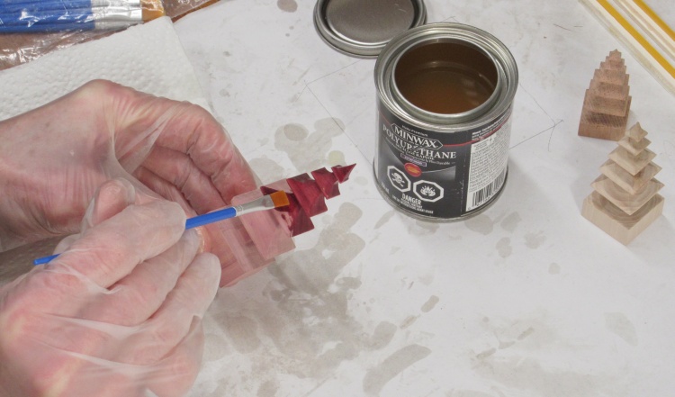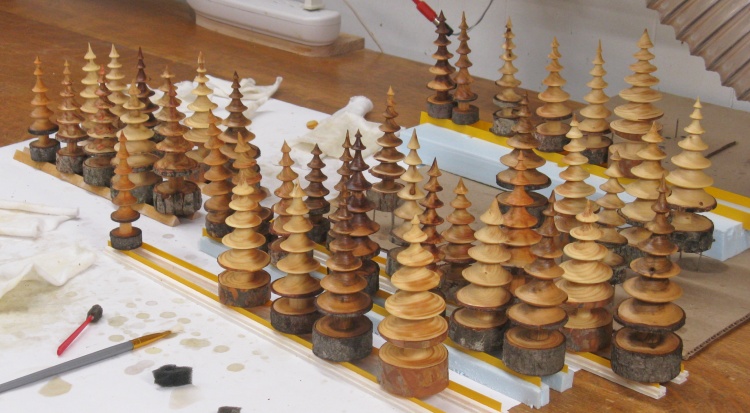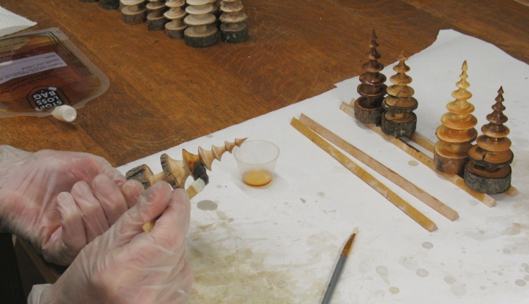 Once again I used two coats of Danish oil and here I'm applying the first coat with a small foam brush to one tree while it soaks into the wood on the four trees in the background.