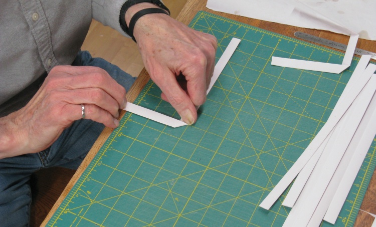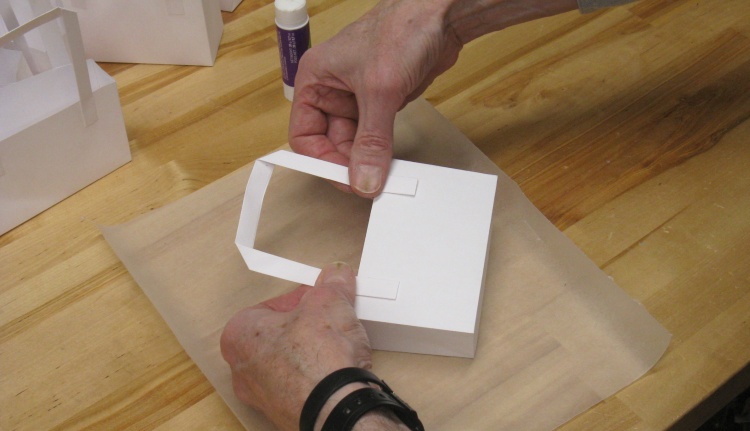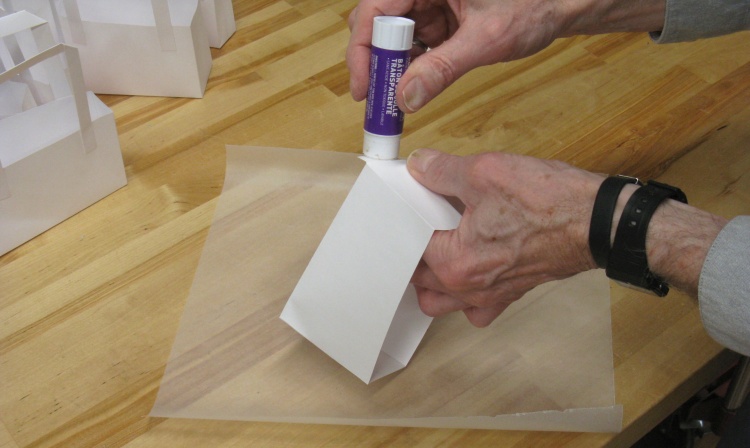 The handle strips had been made by folding the 11" side of a sheet into three layers and gluing them closed. In this shot I'm folding them to form the two legs.