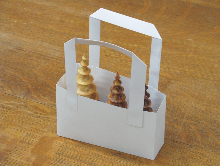 After all the leaves were gone and snow had come to stay and the December page was displayed on the calendar, I decided the time was ripe to see if people wanted some extra Christmas clutter. But how does one handle/transport/present an awkward little set of wooden trees? I eventually settled on folding up some custom paper bags as something that would fill the need and not be too precious to toss away.