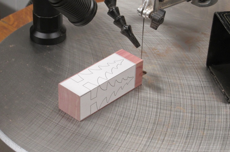 I started with a nice soft wood - Aromatic Cedar - and glued the pattern to two adjacent sides. Here it is ready to drive forward whenever the saw hears the "Gentlemen, start your engines".