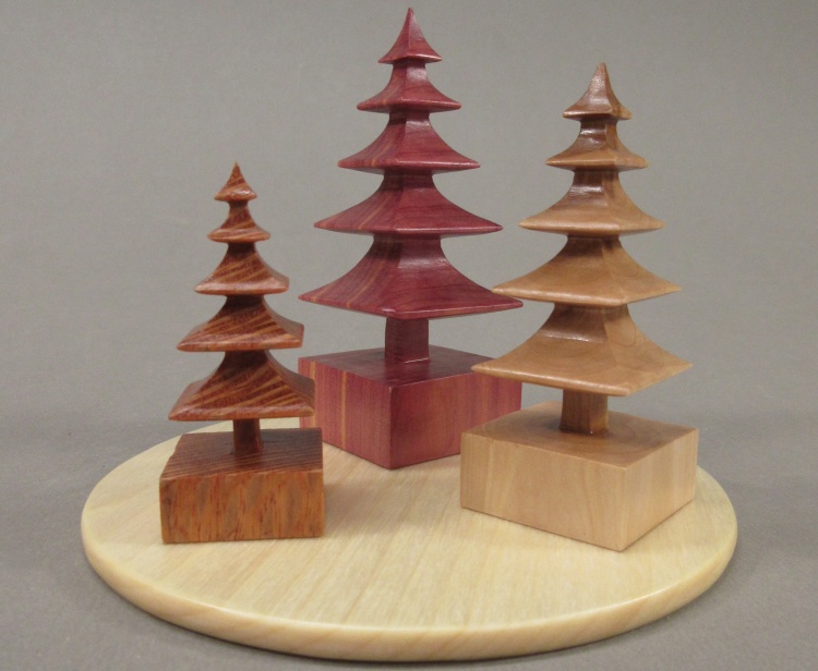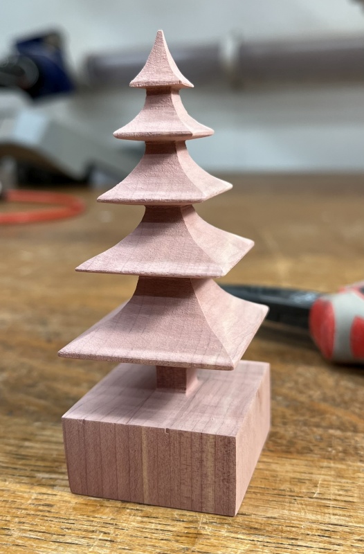 After making a few more turned tree sets in early 2026, I started wondering what a square version of the trees would look like. I had recently bought a new scroll saw (which would be the best tool to make these) so this seemed like a good match and I started with an Aromatic Cedar blank to see how it would turn out. When the tree was done, I thought it looked pretty good so I went ahead and made another couple trees for a set of three.