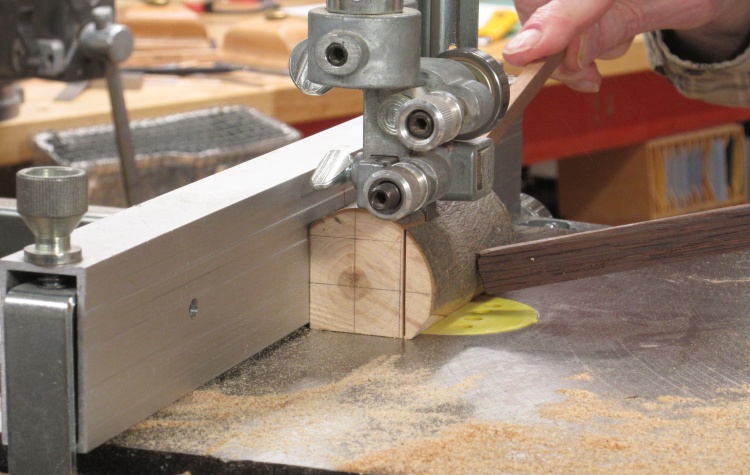 Step one was to chose a couple other woods with one of them shown here being cut into the "medium" tree blank. It's a piece of a stored branch from - if I recall correctly - my Mother-in-law's yard, species unknown. My past self was a bit lackadaisical about labelling, it would seem.