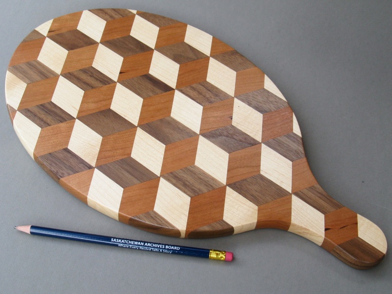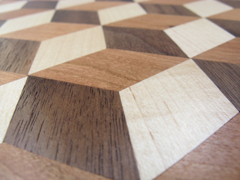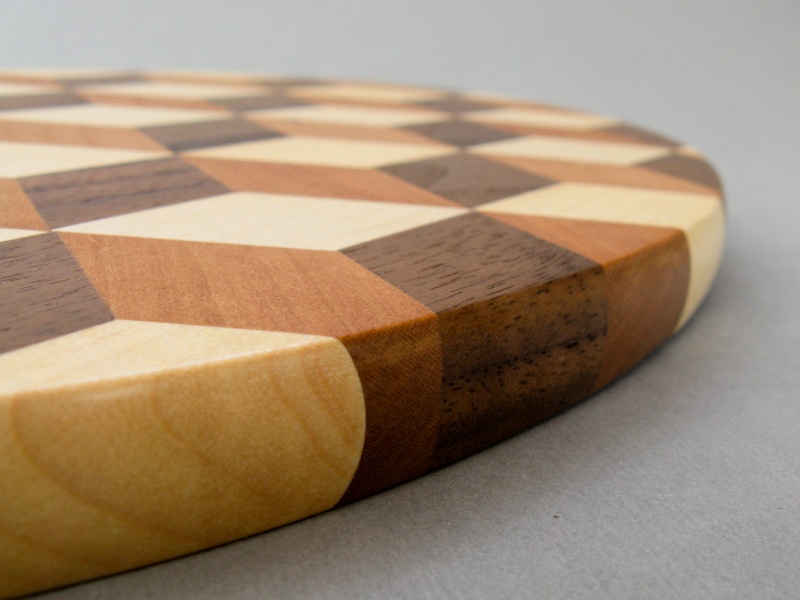 The trivet is composed of individual pieces of maple, cherry and walnut woods that are laminated in a repeating pattern. The challenge with this type of construction is to get all the pieces exactly the correct size and shape so they align perfectly and fit together without visible seams. I didn't really get as close to that ideal as I would have liked, but some selective edge sanding helped so that in the end it looked fine from a modest distance. Especially with a pot on top. And I have the