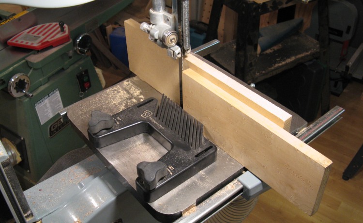 The bandsaw was used to cut the plies, which ended up being just shy of 1/8" thick. I was able to get four thin pieces from a single plank. That was enough for the top and bottom, and then I needed another three pieces for the middle ply.