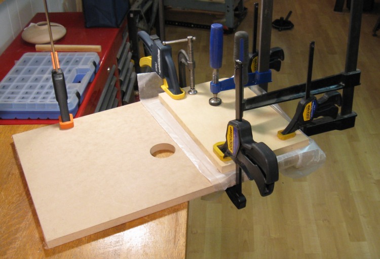 So with the three plies all made and their facing sides smoothed off with the planer again, they were laminated and glued together. I used some MDF pieces in this setup to provide flat faces for the clamping and to help spread the clamp pressure evenly.