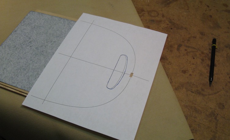 In this shot you can see the uneven edges of the laminated pieces. Here I'm marking the shape of the handle hole using carbon paper.