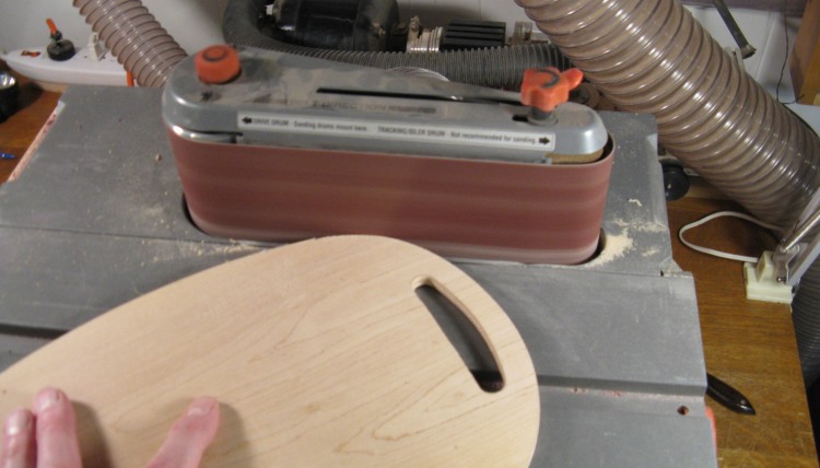 For the outside contours, I just traced our bamboo trivet onto the blank to get the shape and then cut it out with a bandsaw. Here the outline is being smoothed using a belt sander.