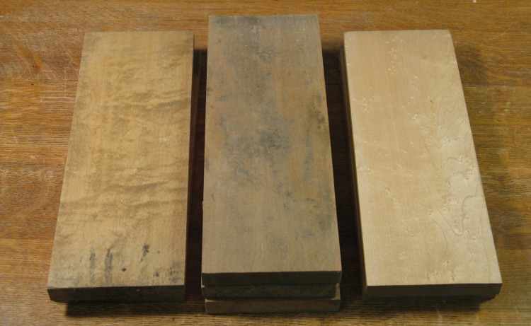 The planks I started with were about a foot long and around 3/4" thick. The top plank on the right has been cleaned off and run through the jointer to remove the finish and almost looks like birdseye maple.
