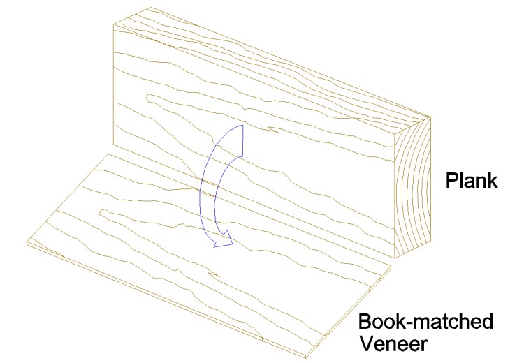 And for the non-woodworking-inclined, here is an illustration of book matching (done years ago for another project, but I wanted to get more use out of all those great wood-grain patterns I had to draw for this one).