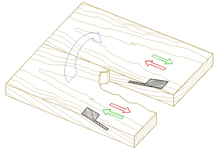 One problem with making a book-matched piece is that the grain relative to the faces is opposite on the two halves as this drawing shows. The black planes extending out of the wood follow the grain direction. This difference becomes a problem if a bladed tool such as a planer is used (either power or manual). The blade moving against the upwards grain can gouge out small pieces, resulting in a poor surface finish. Blade movement in the direction of the green arrows is good, red is bad so obviously you can't do both sides at once and get a good result.