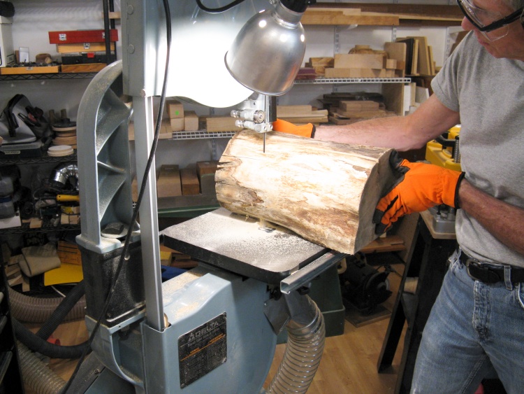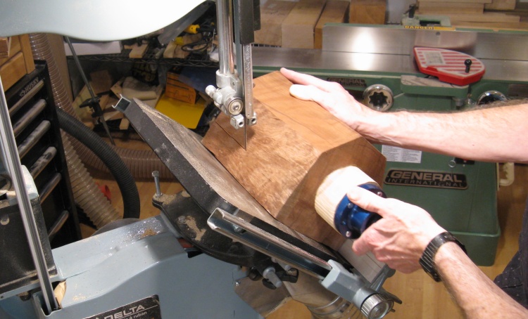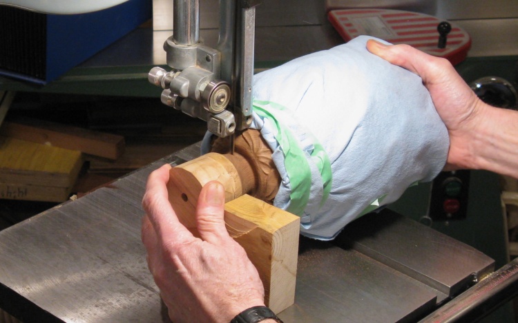 The base still had the protruding wood from the turning process which needed to be removed and in this photo it is getting cut off with the bandsaw.