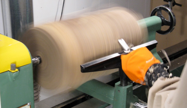 And here the blank is mounted on the lathe and ready to get rounded off.