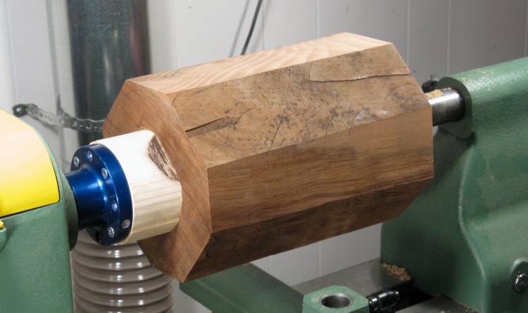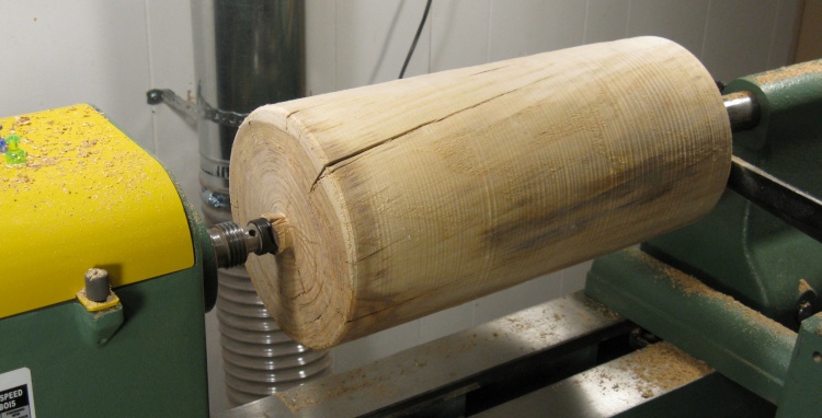 This not-very-round-or-balanced blank went on the lathe where it was tamed using the roughing gouge.