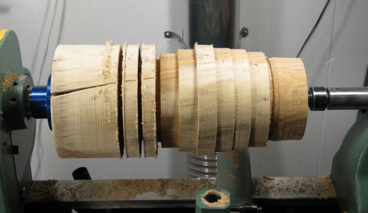 That got it to the cylinder stage shown here. I then marked lines every inch or so in preparation for cutting slots to the appropriate depth.