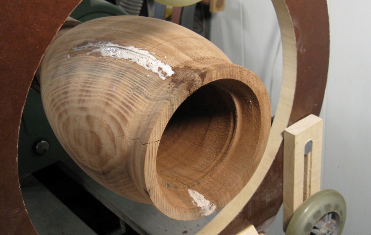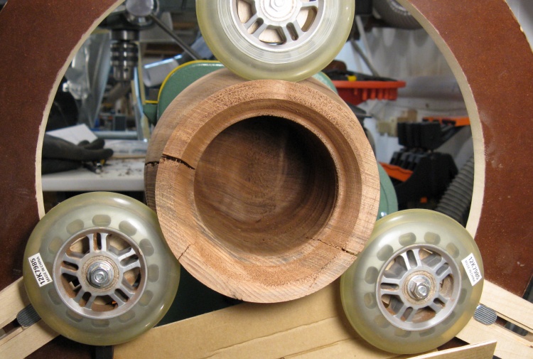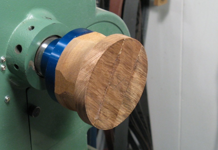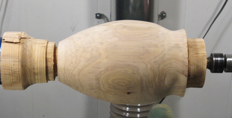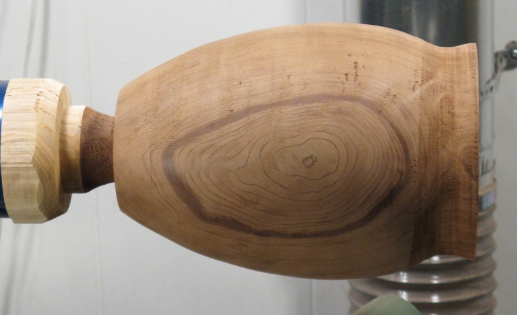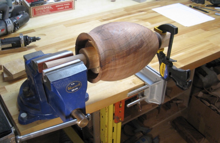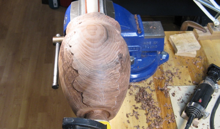 The large central piece of wood will remain in place for now to enable clamping the urn for carving.