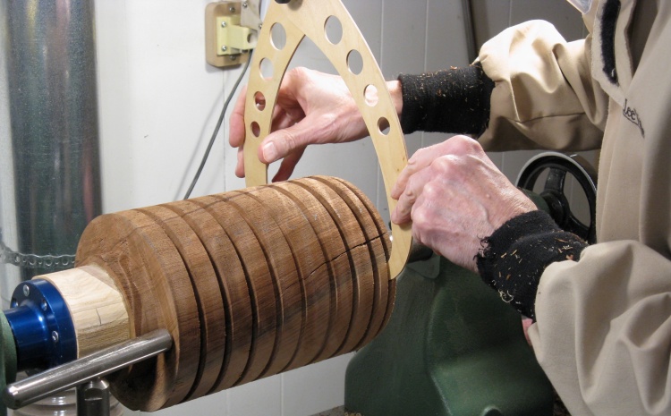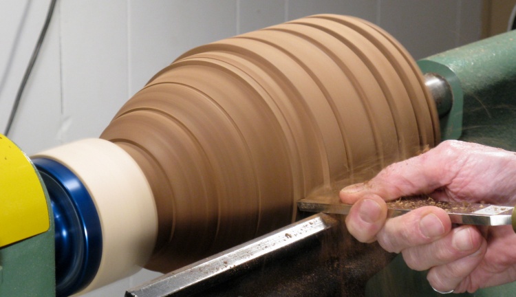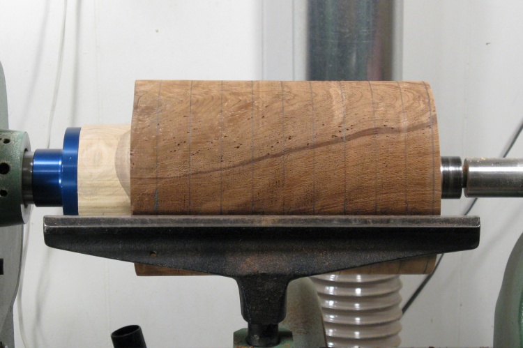 As before the roughing gouge was used to remove the corners and round off the blank to a cylinder. In this photo, I've already drawn the guide lines with one-inch spacing to help transfer the shape from the plan to the wood.
