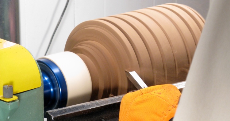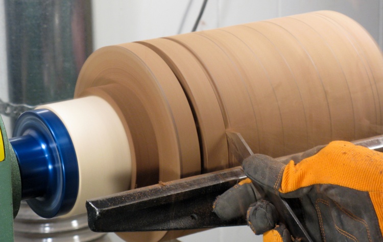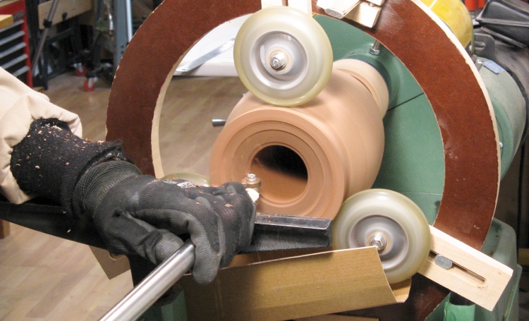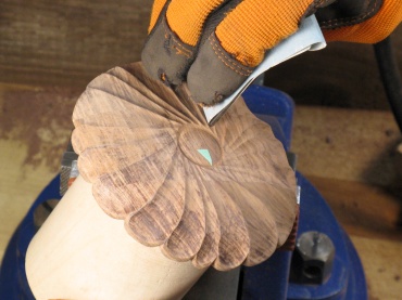 This photo shows a cylindrical rubber form for the sandpaper being used to sand the concave face of a leaf.