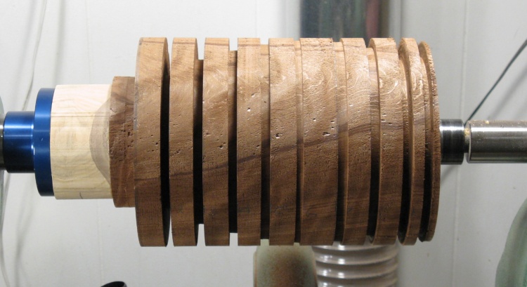 Here a few pieces have been laminated, mounted to the lathe and cut to a circle.