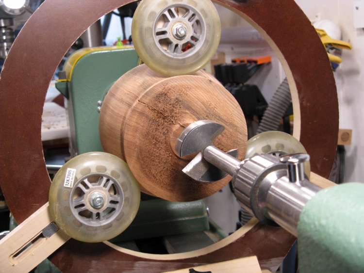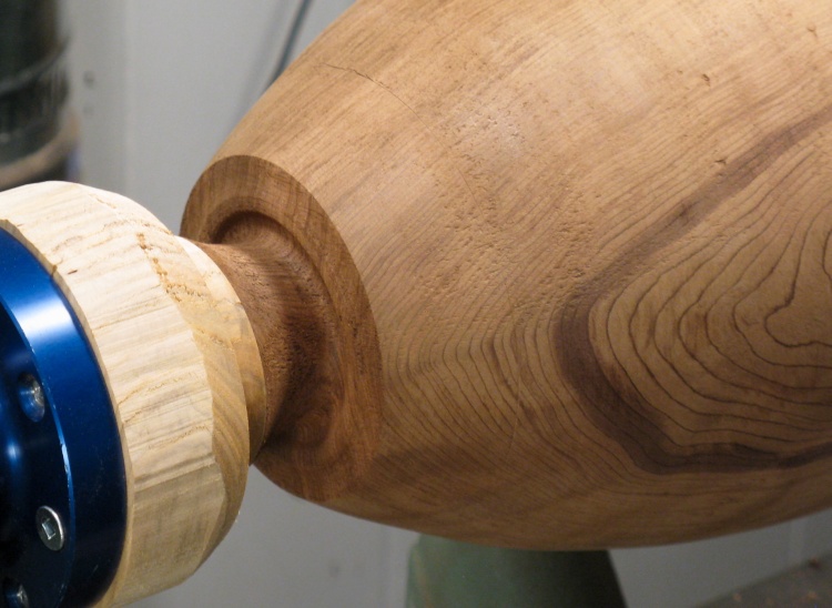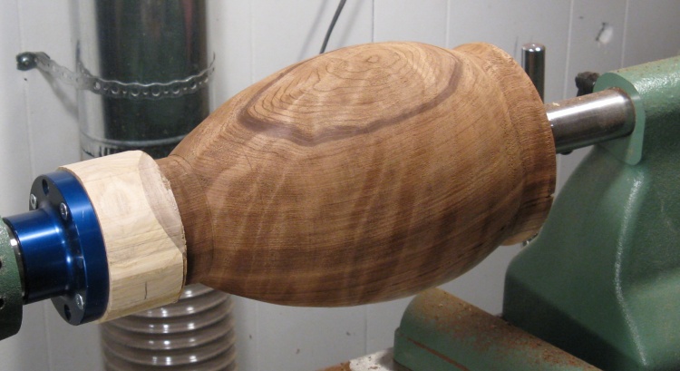 I left a bit of extra material on thinnest section of the neck since the steady-rest wheels will ride there for hollowing. When that is done, I'll cut that wood out since it may be compressed from the pressure of the wheels.