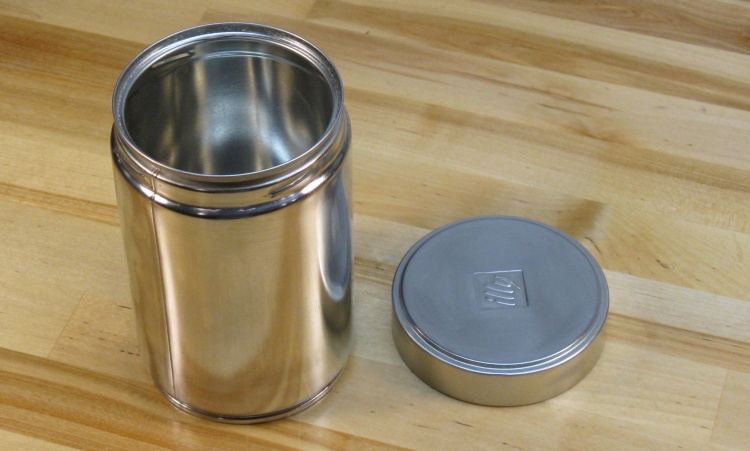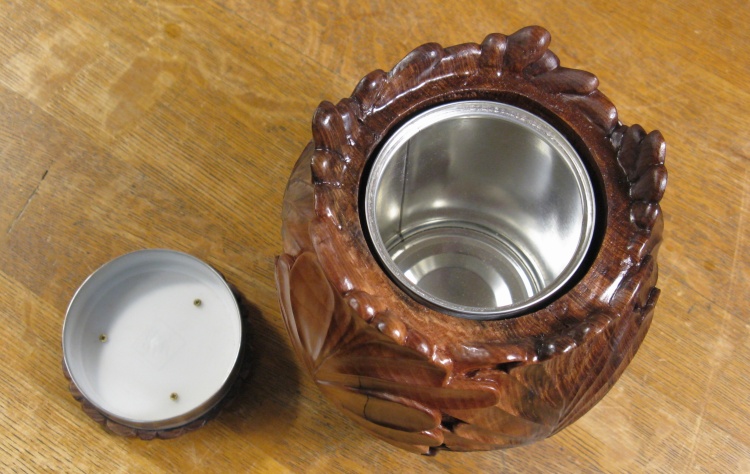 This is the metal liner that will go into the urn when completed. It is made from tin-plated steel and has a screw-on top. The previous resident of this liner before steel-wool-assisted removal of the label was "illy"-brand coffee as is betrayed by the embossed lid.