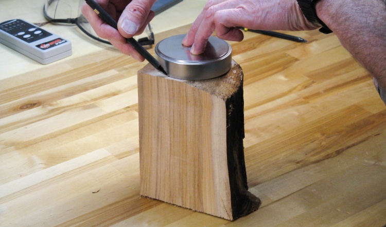 Here I'm using another piece of the scrap log and marking the diameter on it in preparation for making the plug. For a crappy piece of spruce from an old wood pile, it actually has a pretty nice grain.