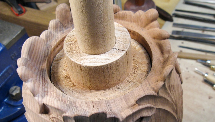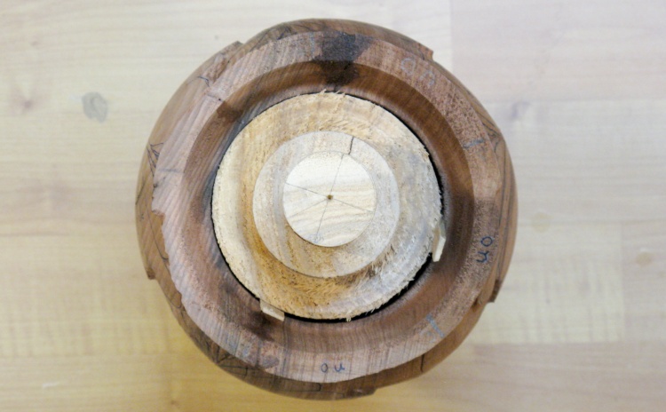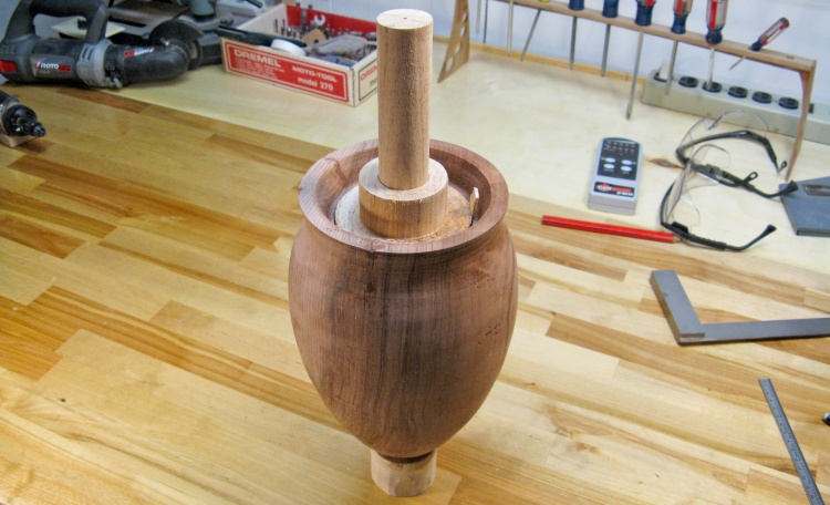 I had the protruding central piece of wood on the bottom to aid in clamping, but the top was just a big hole. To be able to hold the top too, I made a big wooden plug with a protruding dowel.