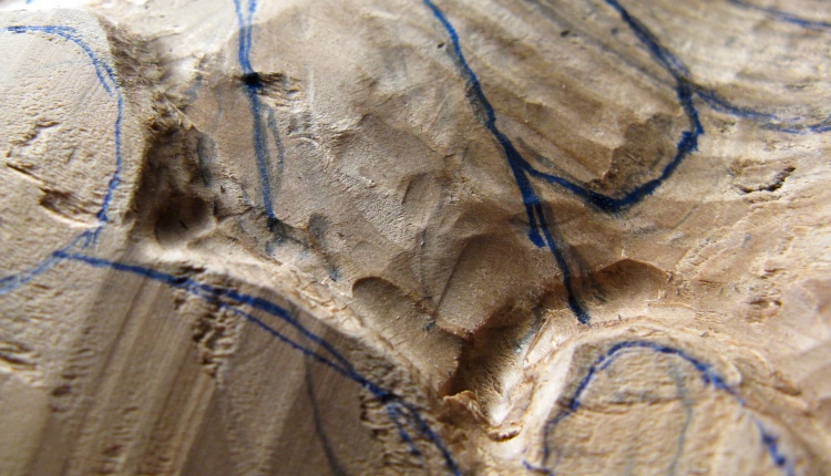 This is some carving happening a bit further along. Here I've also tried out the "hole" where there is no leaf cover. I didn't plan to go much further with this piece since it was just for investigation purposes.