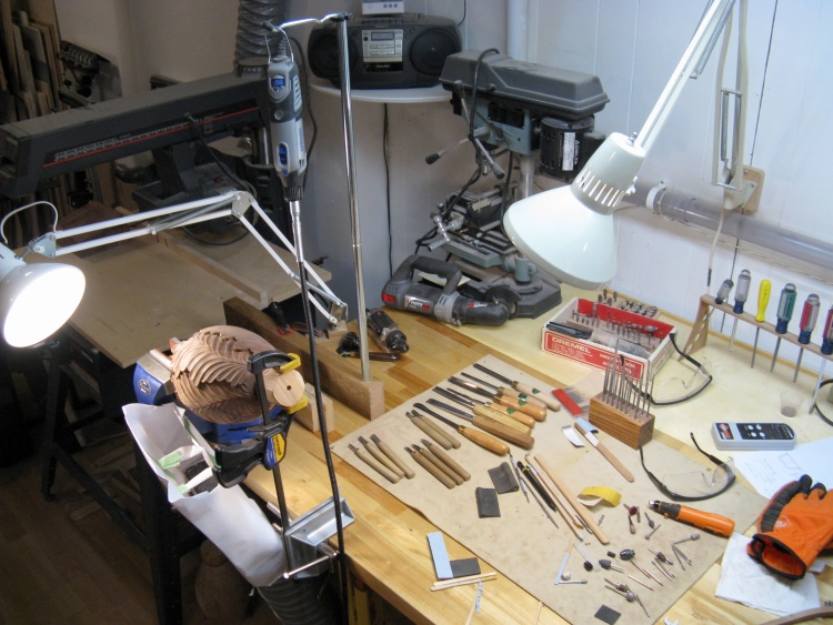 This shows the corner of the bench that I used for carving. It has a couple of rotary tools (used a lot), the carving tools (not used too much), the grinding bits (used a lot) and the sanding tools (used way too much). There's also some small files but they didn't end up being too useful.